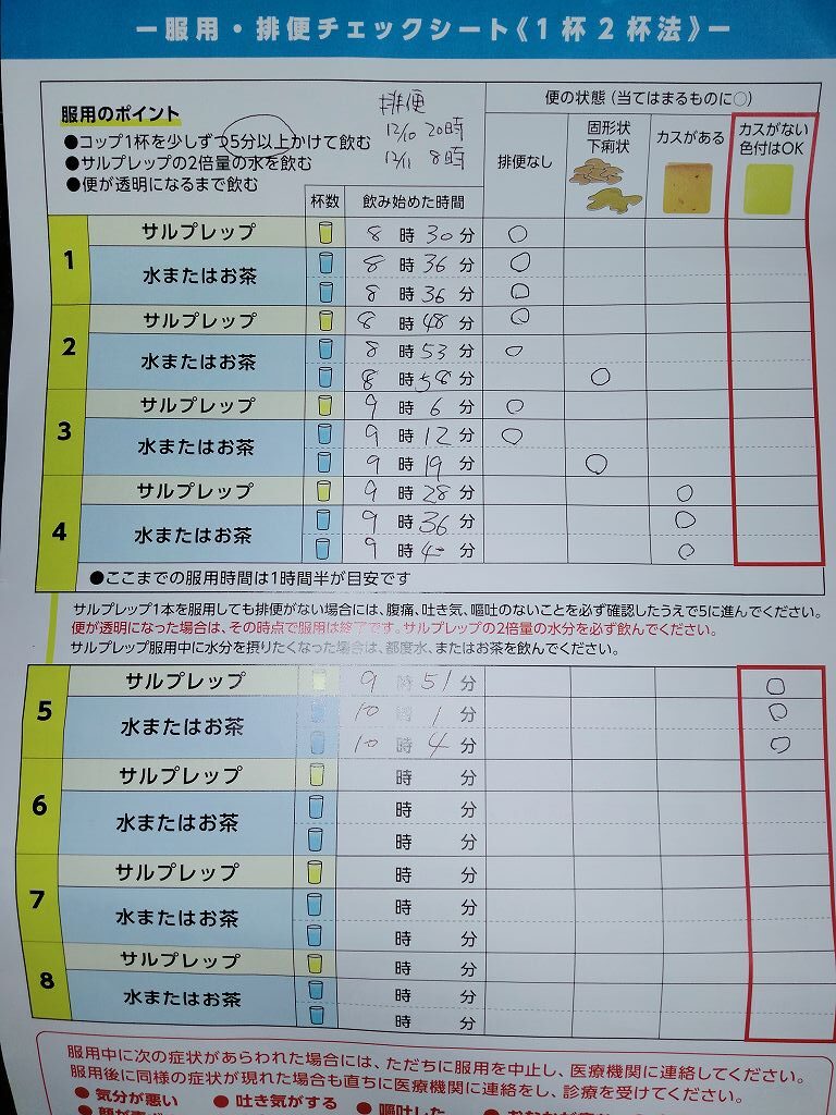 ↑が実際に私が服用してから、どんな便がどれくらいの時間で出たかの記録です。短い間隔で複数回排便したり、下剤服用終了後も排便があるため、排便の回数は○の数より多いです。